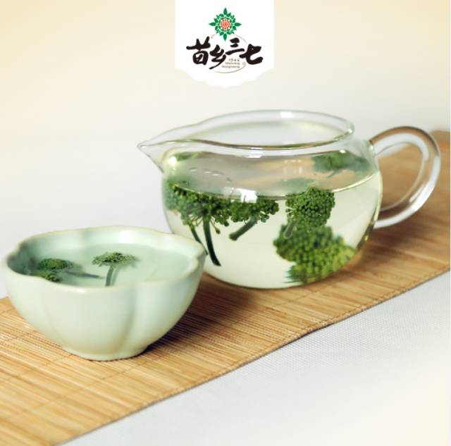 “七花茶”即三七花茶,每年6—8月采摘自未开的三七花蕾,清水洗净,再经自然阳光充足晾晒后即成。三七花性凉、味甘微苦,具有清热、平肝、降压,镇静安神等功效,其汤色翠绿怡人,美感、口味、功效俱佳,是不可多得的健康饮品。